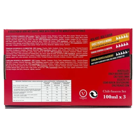 Poivrons, pommes, oignons, vinaigre de vin blanc, clémentines (10%), piment Trinidad Scorpion (6%), ail, citrons verts, huile d’olive, sel marin