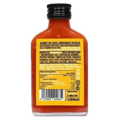 Ingrédients: Poivrons, tomates (22 %), oignons, piments Habanero (20 %), vinaigre de vin blanc, pommes, citrons verts, ail, huile d’olive, sel marin.
